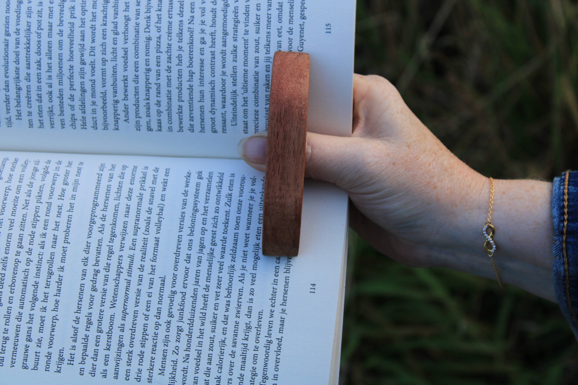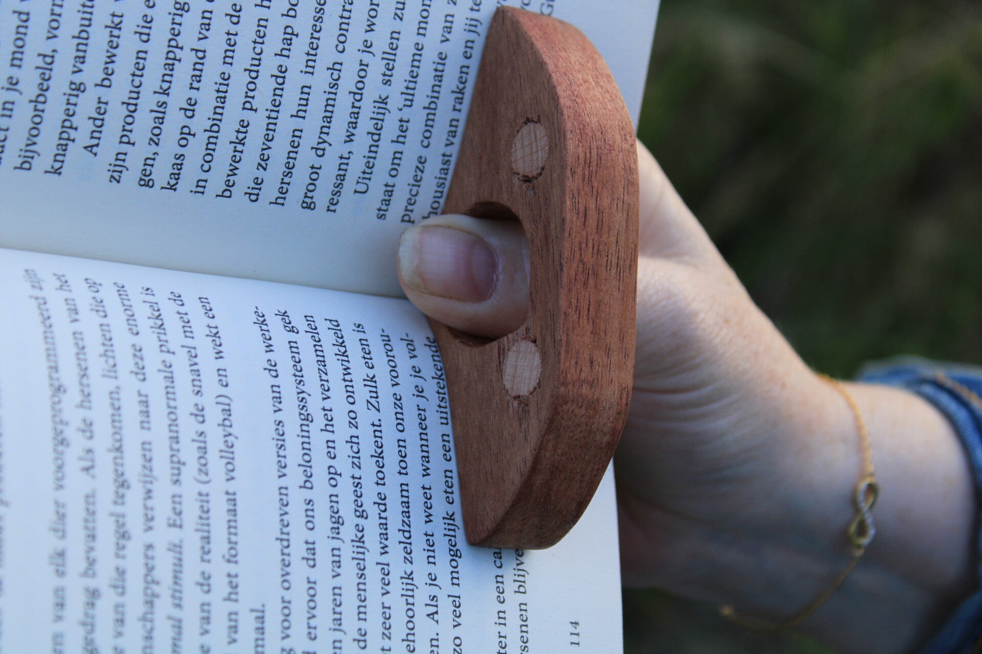 De Bladwijzer is gemaakt van twee verschillende hout soorten om er een luxere look aan te geven, ook is het behandeld met antiek was om de bladwijzer een zachter gevoel te geen en de lezer iets meer grip te geven tijdens het lezen.